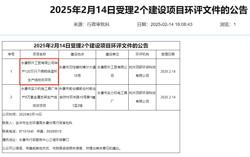 2025年2月14日,金華市生態(tài)環(huán)境局永康分局受理永康那升工貿有限公司年產120萬只不銹鋼保溫杯生產線技改項目環(huán)境評價報告表并對外進行公示。