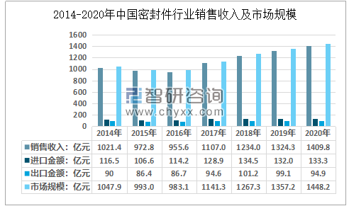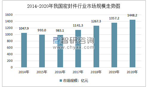2014年我國(guó)密封件市場(chǎng)規(guī)模為1047.9億元,2020年我國(guó)密封件市場(chǎng)規(guī)模增長(zhǎng)至1448.2億元,2014年以來(lái)我國(guó)密封件行業(yè)規(guī)模復(fù)合增速為5.54%。