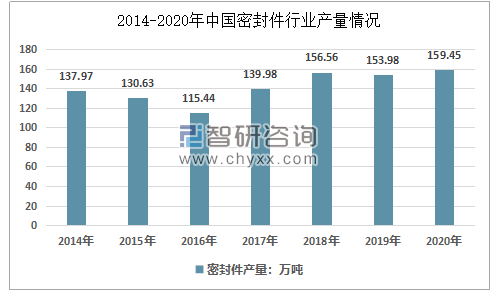 智研咨詢發(fā)布的《2021-2027年中國(guó)密封件行業(yè)市場(chǎng)運(yùn)行態(tài)勢(shì)及發(fā)展前景研究報(bào)告》數(shù)據(jù)顯示:幾年,我國(guó)密封件行業(yè)產(chǎn)量整體呈現(xiàn)增長(zhǎng)態(tài)勢(shì),從2014年的137.97萬(wàn)噸增長(zhǎng)到了2020年的159.45萬(wàn)噸。近幾年我國(guó)密封件行業(yè)產(chǎn)量情況如下圖所示: