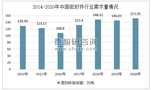 2020年我國(guó)密封件行業(yè)需求量151.91萬(wàn)噸,同比2019年的146.03萬(wàn)噸增長(zhǎng)了4.03%,近幾年我國(guó)密封件行業(yè)需求量情況如下圖所示: